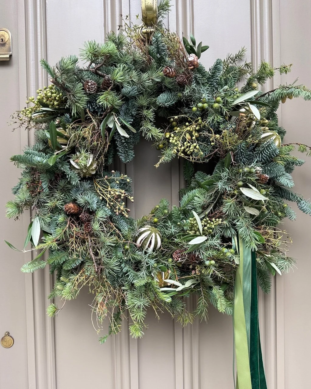 This year we’ve designed two Christmas wreaths to choose between. ‘Midwinter’ is our sophisticated wintry pink and grey wreath. ‘Evergreen’ is our foliage and berry filled rich green spruce wreath full of texture, delicate pine cones and dried fruits. All our wreaths are hand made the traditional way with moss and fresh foliage in our studio. Delivery or collection from the studio is from 30 November.