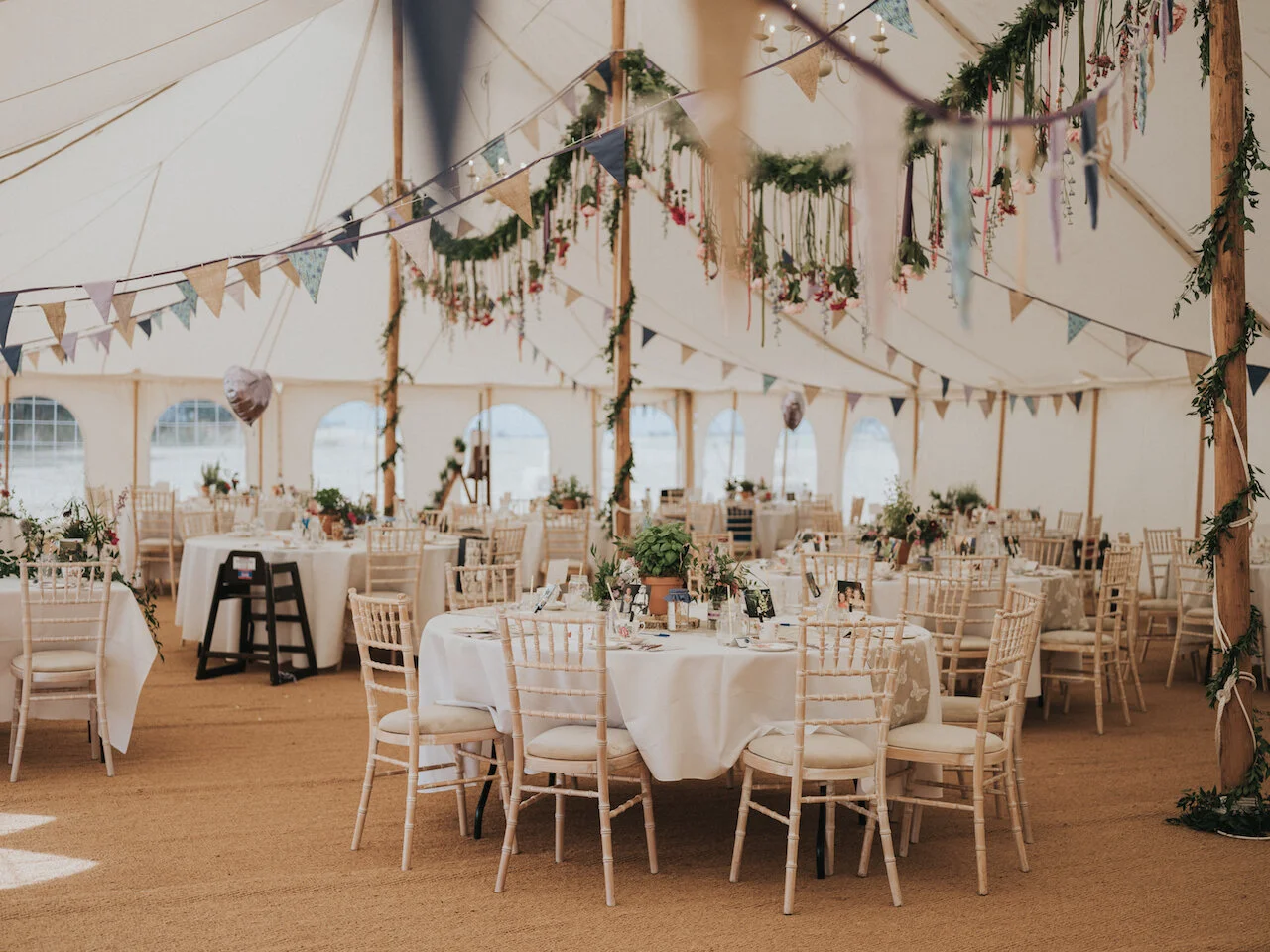 The piece de resistance was Lucy and Tom’s floral hanging piece. The poles of the marquee were decorated with greenery garlands. Suspended between the upright poles was a huge lush greenery garland full of hanging flowers and ribbons. This fluttered gently in the gentle (and occasionally gusty!) breeze.