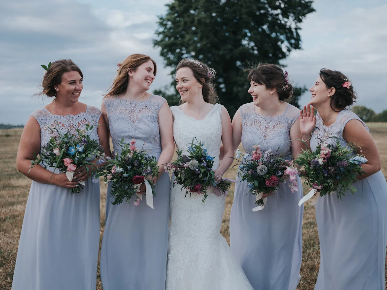 Tom and Lucy chose a muted pastel colour palette with pops of darker tones. Bouquets were relaxed scoops full of mint, sweet peas, dahlias, larkspur and alliums all gathered together with silk and satin ribbons.